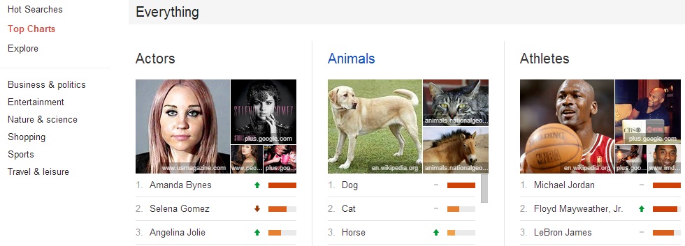 בלחיצה על פיצ'ר זה בתפריט הימני ב Google Trends ניתן לצפות בתצוגת חיפושים פופולאריים לפי תחומים.